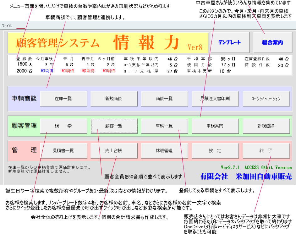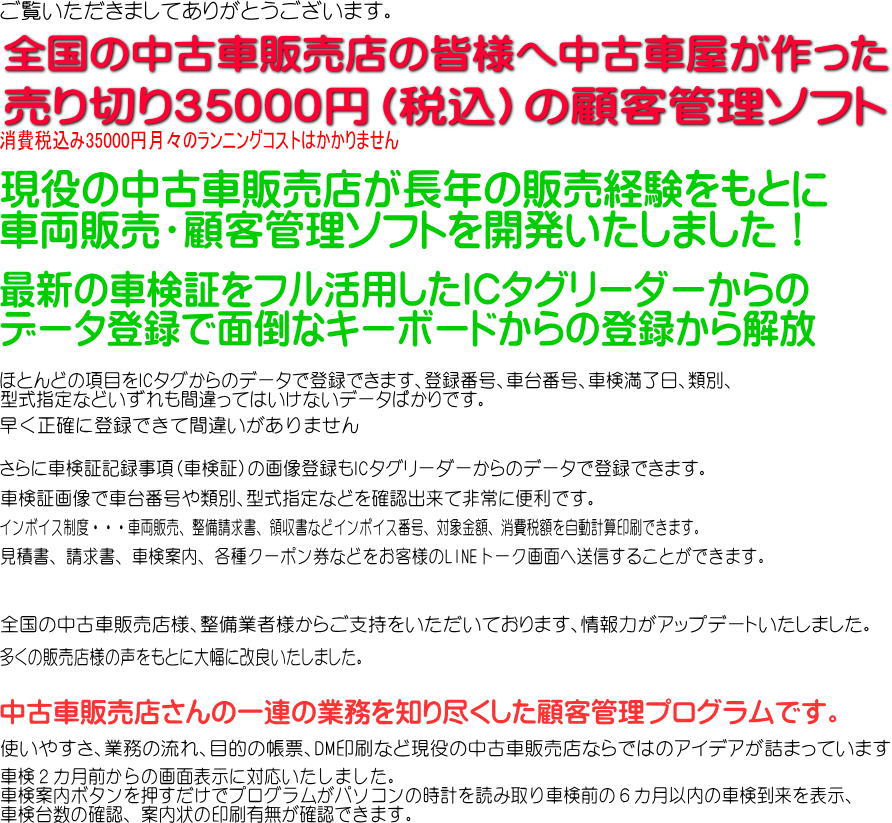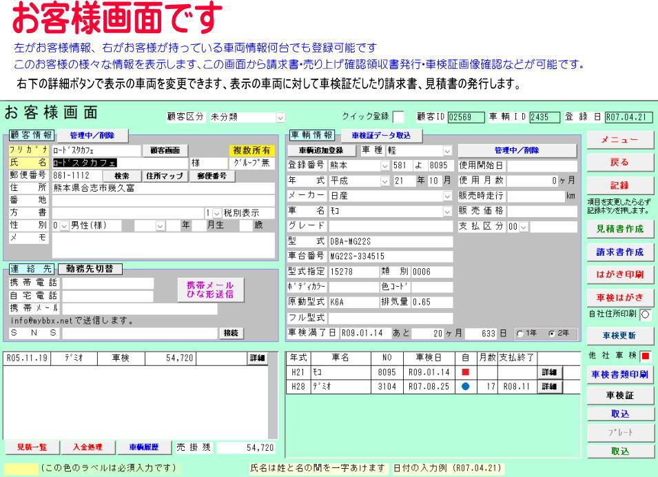 はがき宛名印刷、車検証確認、車検日確認、車検まであと何日、車検書類印刷、所有月数、取引履歴、領収書発行などなど日頃の業務を効率的にこなします